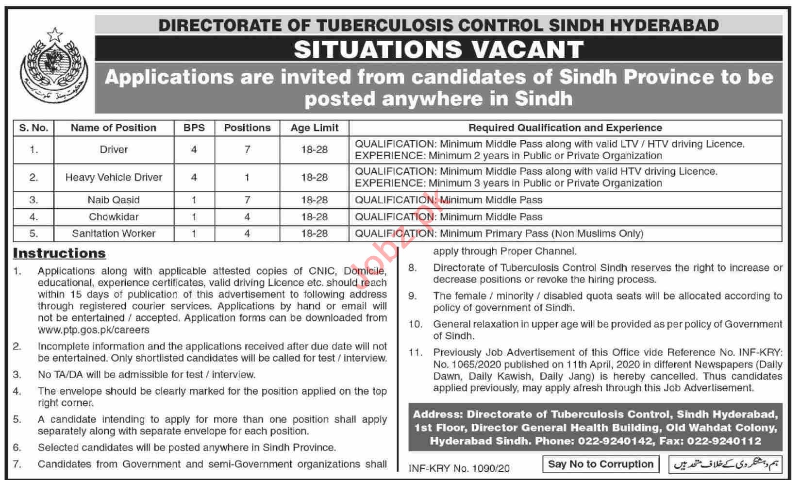 Directorate Tuberculosis Control Hyderabad, TB Control Health Department, Health Department, Government of the Sindh are seeking candidates for the posts of Driver, LTV Driver, HTV Driver, Heavy Vehicle Driver, Naib Qasid, Peon, Chowkidar, Watchman, Sanitation Worker, Sweeper.