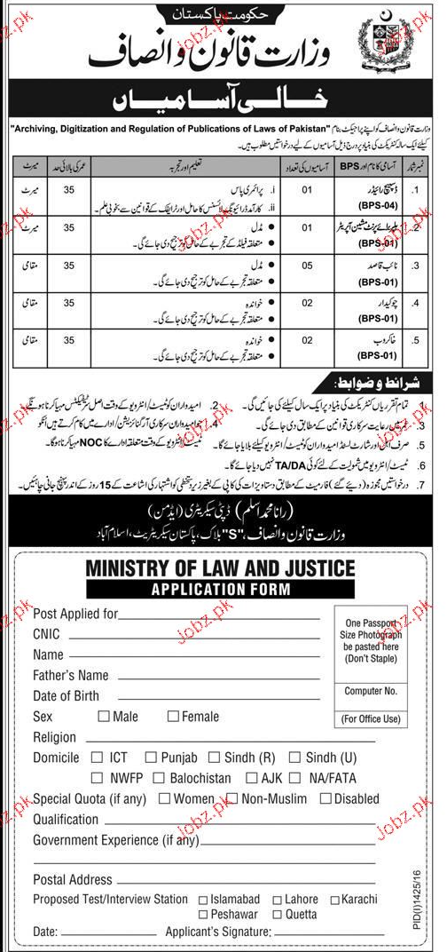 Dispatch Riders, Machine Operators and Naib Qasid are required in Ministry of Law in islamabad.
