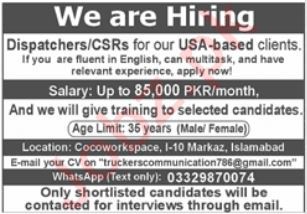 Private Company I-10 Markaz Islamabad, islamabad Islamabad Pakistan invites applications from eligible candidates for the post of dispather and csr as per advertisement of April 6, 2025 published in daily Jang Newspaper. Candidates with Master and Bachelor etc. educational background will be preferred.