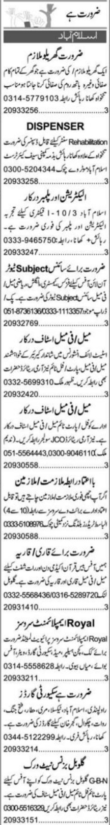 Private Company Islamabad, murree, rawalpindi, chakwal, taxila, hattar, fateh jang and gujar khan Islamabad Pakistan invites applications from eligible candidates for the post of security guard, waiter, maid, quran teacher, kitchen helper, mathematics teacher, house servant, teacher, solider, qaria, plumber, electrician, physics teacher, office boy, insurance agent, chemistry teacher, english teacher, husband wife, dispenser, science teacher, jco, office staff, qari and cook as per advertisement of May 11, 2024 published in daily Express Newspaper. Preferred Education is M.sc, Intermediate, Bachelor, BA, Matric and Middle etc.