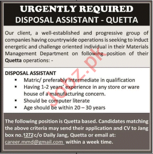 Disposal Assistant Jobs 2020 In Quetta