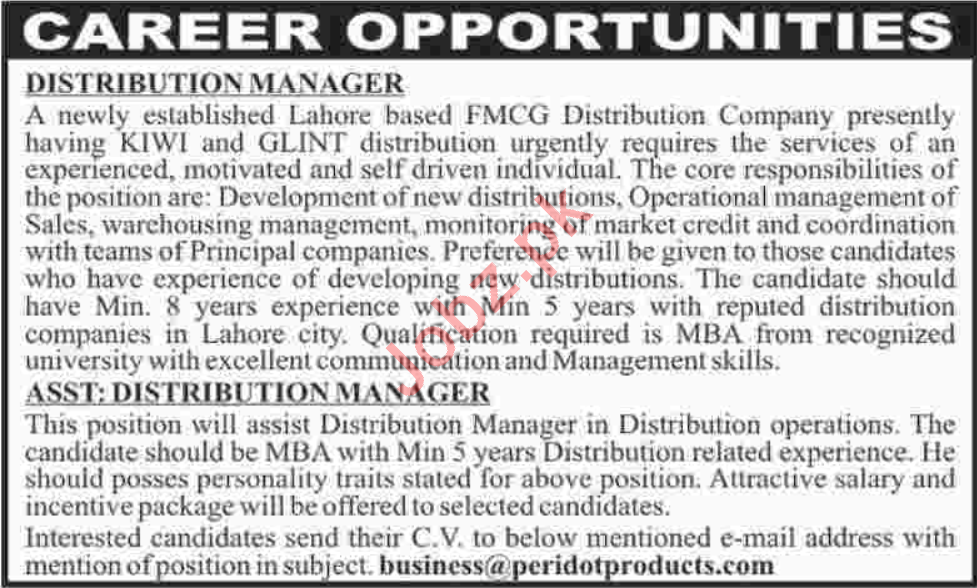 Vacancies in FMCG Distribution Company Advertisement December 2019