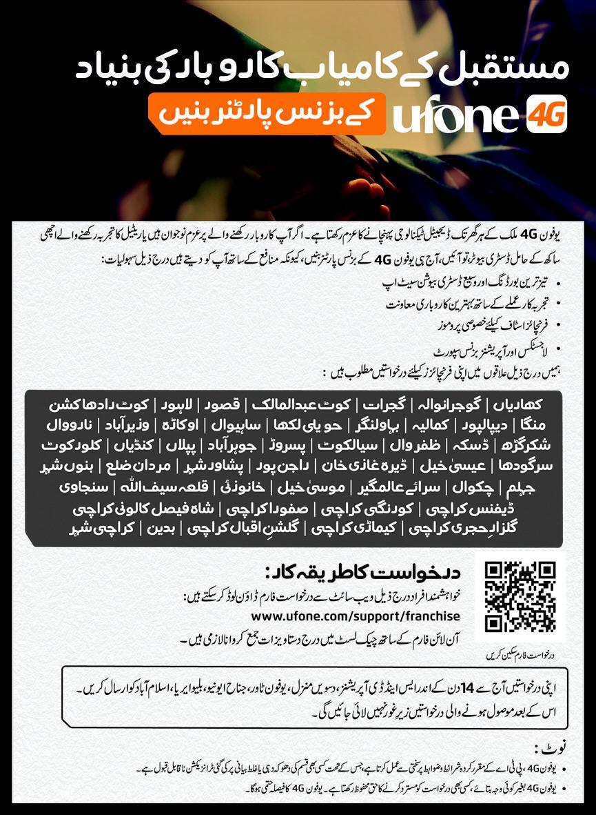 Ufone Mobile Operator Company Lahore, lahore Punjab Pakistan invites applications from eligible candidates for the post of distributor as per advertisement of October 12, 2025 published in daily Express Newspaper. Preferred Education is Bachelor etc.
