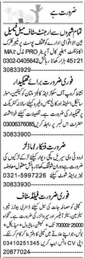 Private Company jobs advertisement dated about 11 November 2022 in daily Express Newspaper invites application for the vacant post of actor, distributor, supervisor, public relation officer, contractor, model, salesman, manager, sales officer, clerk, call operator, helper, pro and accountant in Multan, multan Punjab Pakistan. Intermediate, Matric, Middle and Bachelor etc. educational qualification will be preferred.