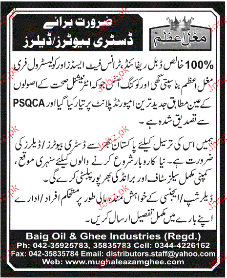 Distributors are required in Baig Oil and Ghee Industries in Lahore