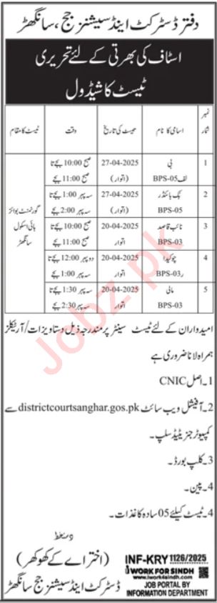 District and Session Judge Sanghar, sanghar Sindh Pakistan invites applications from eligible candidates for the post of chowkidar, naib qasid, mali, book binder and belf as per advertisement of April 13, 2025 published in daily Jang Newspaper. Educational qualifications required Primary, Matric, Intermediate and Middle etc.
