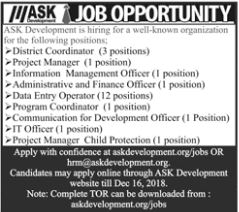 A well reputed ASK Development Company is looking for District Coordinator, Project Manager, Information Management Officer, Administrative Officer, Finance Officer, Data Entry Operator, Program Coordinator, Communication For Development Officer, IT officer, Project Manager child Protection in Karachi.