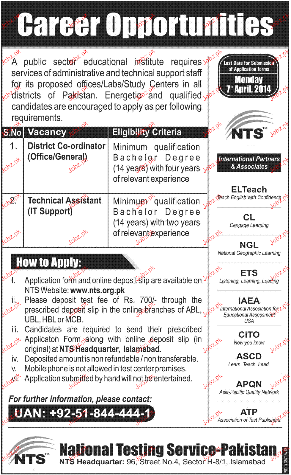 Apply as per details in job advertisement. Login to view further details of how to apply via https://www.jobz.pk online.