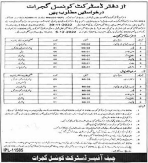 Vacant posts including beldar, tube well operator, valve man, chowkidar, naib qasid, plumber, tractor driver and sanitary worker are announced in District Council Gujrat, gujrat Punjab Pakistan as per 12 November 2022 advertisement in daily Daily Pakistan Newspaper. Candidates with Matric, Middle and Primary etc. educational background will be preferred.