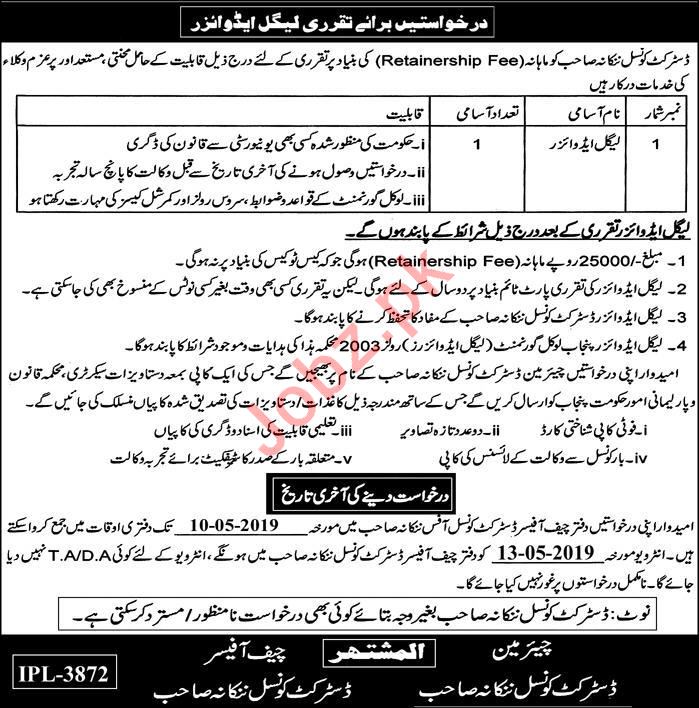 District Council Nankana Sahib Legal Advisor Jobs 2019