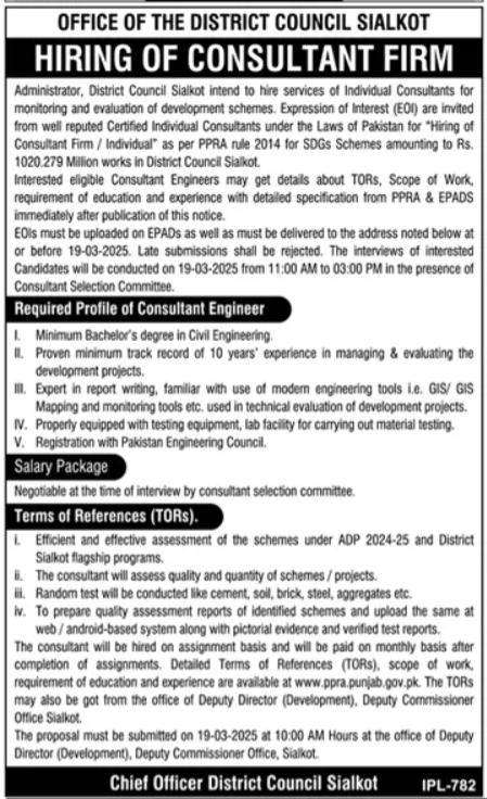 District Council jobs advertisement dated about 28 February 2025 in daily Dunya Newspaper invites application for the vacant post of individual consultant and consultant engineer in Sialkot, sialkot Punjab Pakistan. Preferred Education is B.E and Bachelor etc.
