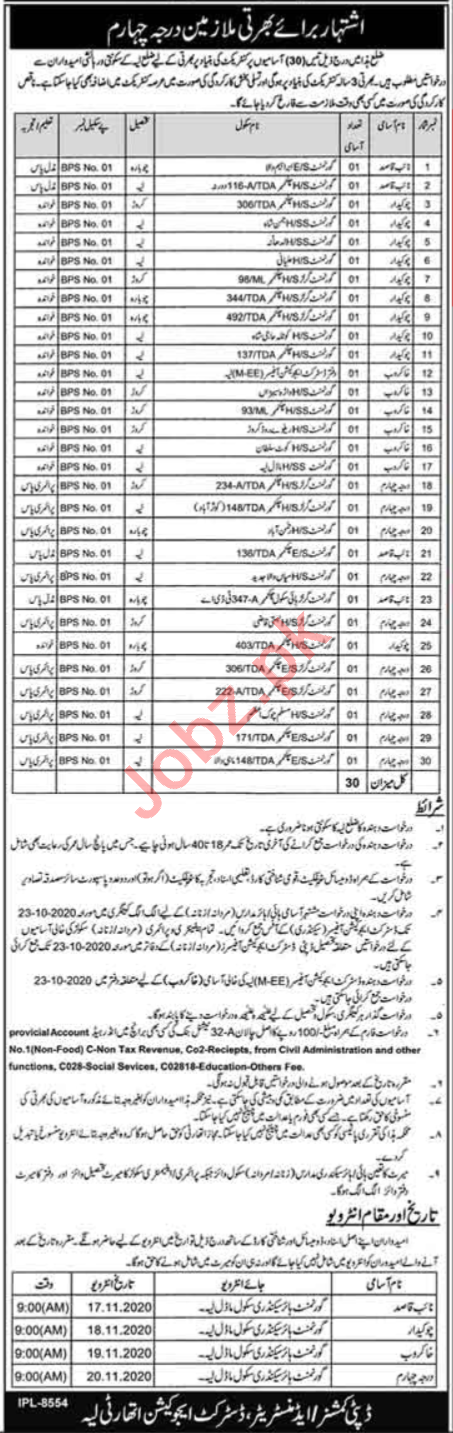 District Education Authority DEA Layyah, Education Department, Government of the Punjab is inviting applications from experienced candidates for the posts of Naib Qasid, Office Boy, Chowkidar, Watchman, Sanitary Worker, Sweeper, Gardener, Mali, Driver, LTV Driver.