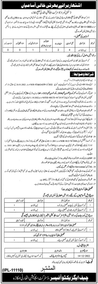 District Education Authority DEA invites applications for job positions advertised in daily Ausaf dated 3 November 2022 for following vacancies in Okara, okara, renala khurd and depalpur Punjab Pakistan.