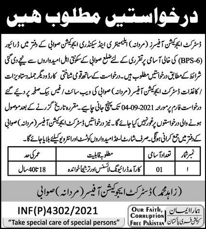 Latest District Education Office Driving Posts Swabi 2025