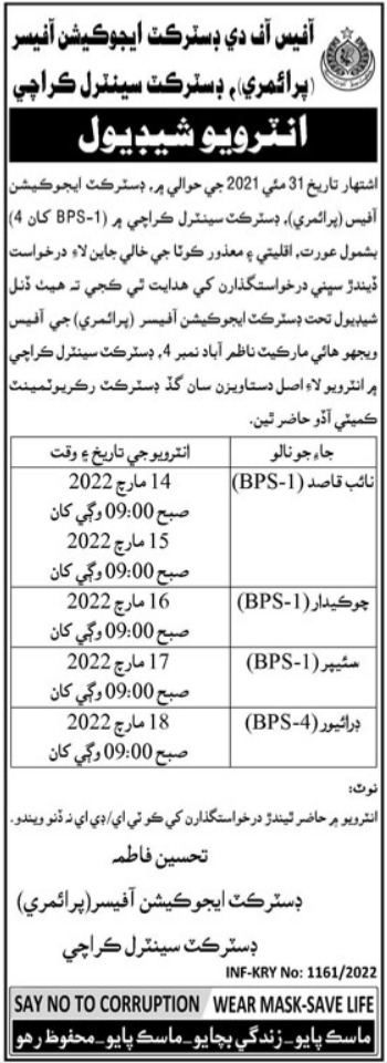 District Education Officer invites applications for job positions advertised in daily Kawish dated 12 March 2022 for following vacancies in Karachi, karachi Sindh Pakistan.