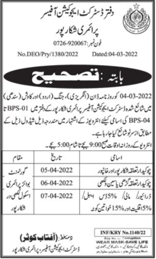 Vacant posts including chowkidar, driver and mali are announced in District Education Office Shikarpur, khanpur and shikarpur Sindh Pakistan as per 12 March 2022 advertisement in daily Jang Newspaper. Candidates with Middle, Matric and Primary etc. educational background will be preferred.