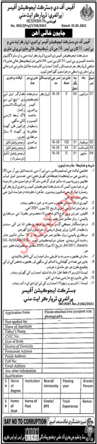District Education Officer DEO Primary Tharparkar Jobs 2021
