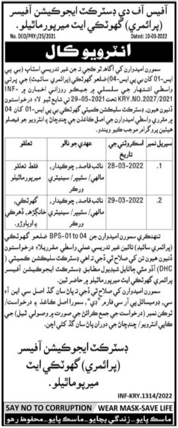 District Education Officer Primary Ghotki, School Education & Literacy Department invites applications for job positions advertised in daily Kawish dated 15 March 2022 for following vacancies in Ghotki, ghotki and mirpur mathelo Sindh Pakistan.