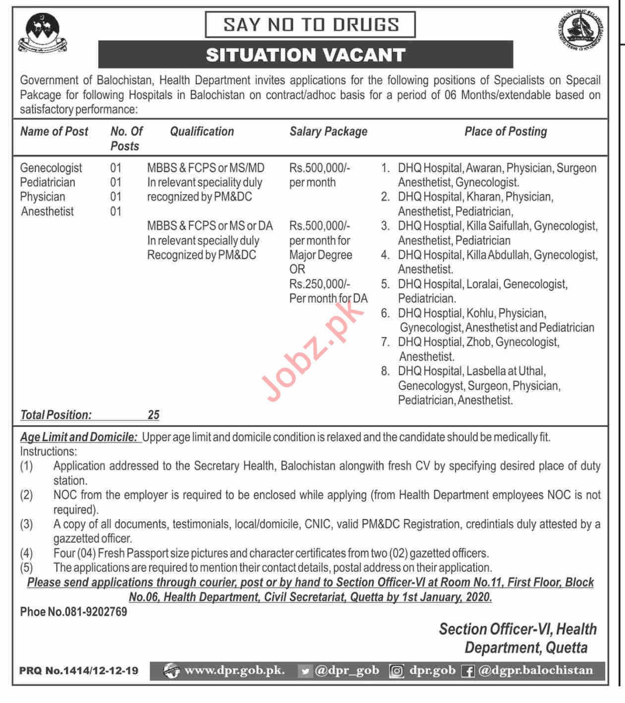 District Headquarter Hospital DHQ Awaran, Kharan, Killa Saifullah, Loralai, Kohlu, Zhob, Lasbella, Health Department, Government of the Balochistan seeks candidates for the posts of Doctor, Lady Doctor, Medical Officer, Woman Medical Officer, Genecologist, Pediatrician, Physician, Anesthetist.