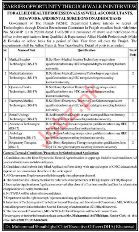 District Health Authority DHA Khanewal, Government of the Punjab are seeks candidates for the posts of Medical Imaging Technologist, Medical Laboratory Technologist, OT Technologist, Emergency Medical Technologist, Urology Technologist, Anesthesia Technologist, Audiology Technologist, Therapist.