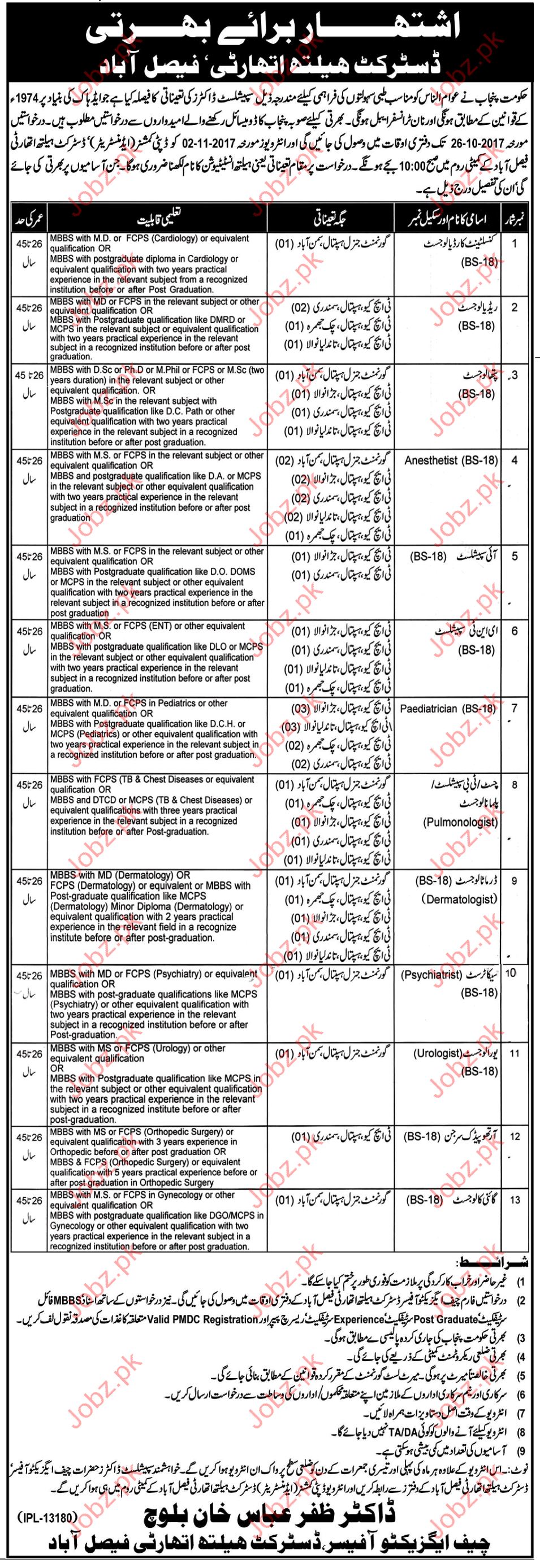 District Health Authority, Faisalabad Government of Punjab required Consultant Radiologist, Radiologist, Pathologist, Anesthetist, Eye Specialist, ENT Specialist, Pediatrician, TB Specialist, Dermatologist, Psychiatrist, Urologist and Orthopedic Surgeon.