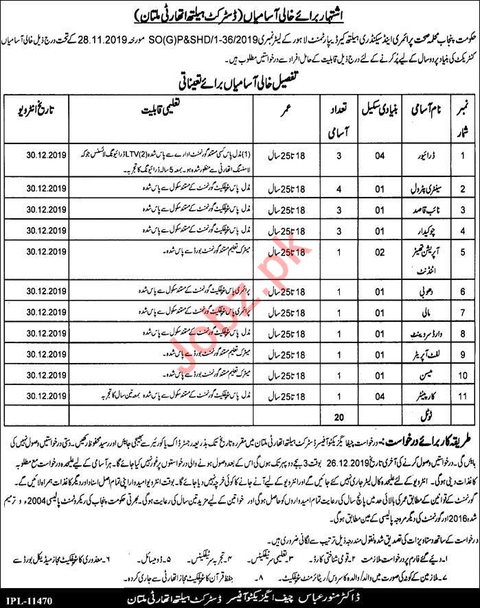 District Health Authority Government of The Punjab Primary & Secondary Healthcare Department requires the services of experienced and responsible personnel for the posts of Driver, Sanitary Patrol, Naib Qasid, Chowkidar, Operation Theater Attendant, Dhobi, Laundry Man, Mali, Ward Servant, Lift Operator, Mason and Carpenter in Multan.