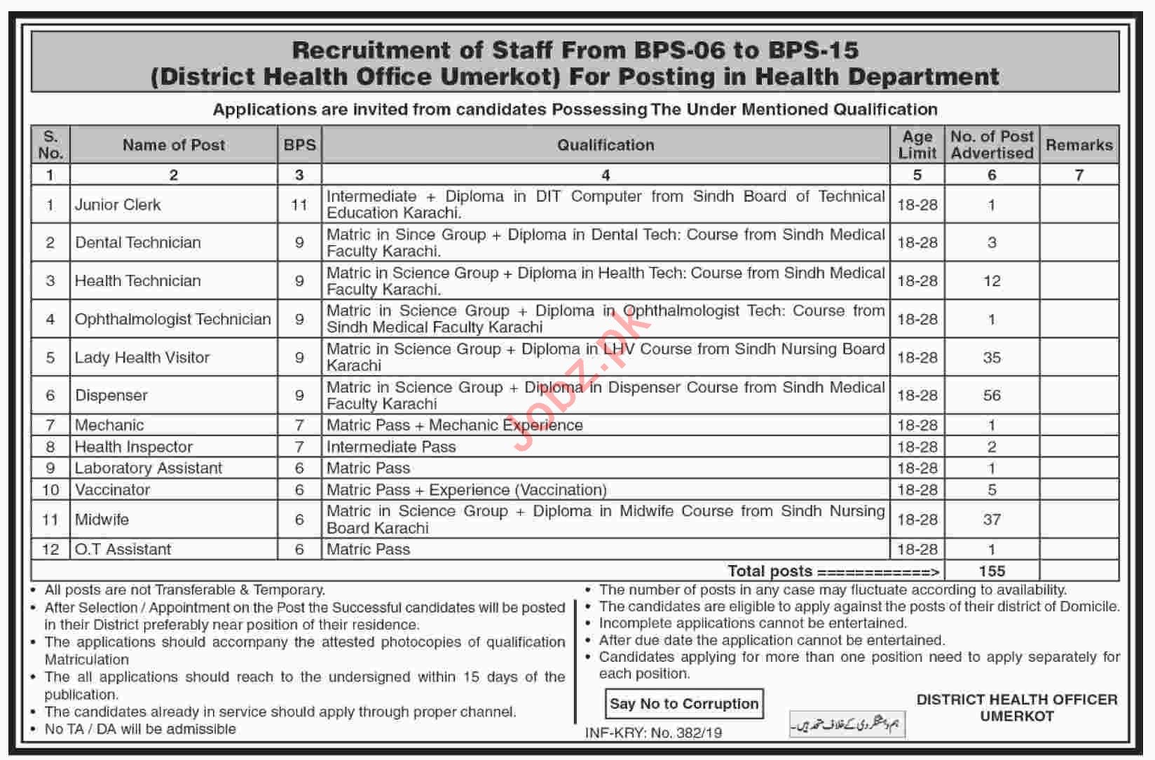 District Health Authority Umerkot, Government of the Sindh seeks candidates for the posts of Clerk, Dental Technician, Health Technician, Orthologist Technician, Lady Health Worker, Dispenser, Mechanic, Health Inspector, Laboratory Assistant, Vaccinator, Midwife and OT Assistant.