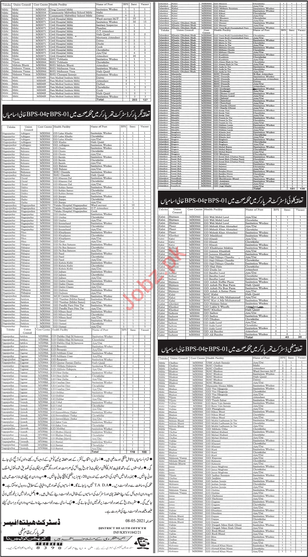 District Health Office DHO Tharparkar, 50 Bedded Hospital, Rural Health Center RHC, Basic Health Unit BHU, Government Dispensary, Health Department, Government of the Sindh needs services for Driver, Nursing Orderly, OT Attendant, Pump Driver, Plumber, Sanitary Inspector, Attendant, Daftri, X Ray Attendant, Laboratory Attendant, Ward Attendant, Female Ward Attendant, Aya, Dai, Chowkidar, Cook, Dhobi, Malhi, Naib Qasid, Sanitary Worker, Sanitation Worker.