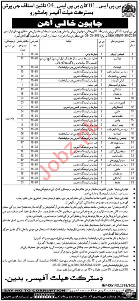 District Health Office Jamshoro is looking for Telephone Operator, Driver, LTV Driver, HTV Driver, Attendant, Ward Servant, Ward Boy, X-Ray Attendant, OT Attendant, Sanitary Inspector, Aya, Dai, Chowkidar, Cook, Washer Man, Dhobi, Electrician, Mali, Naib Qasid, Plumber, plumber Operator, Helper, Security Guard in Jamshoro.