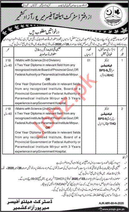 District Health Office Mirpur AJ&K Jobs 2020 for Technician