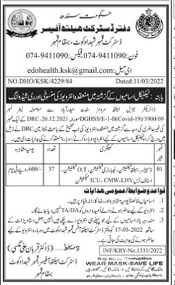 District Health Office invites applications for job positions advertised in daily Jang dated 15 March 2022 for following vacancies in Qambar Shahdadkot, qambar shahdadkot Sindh Pakistan.
