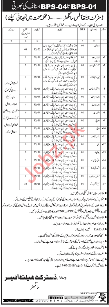 A Well-Known Government Organization District Health Office in Sanghar is looking for qualified, expert and Well-Mannered staff for their Organization for the Job of Driver, OT Attendant, Lab Attendant, Dental Attendant, Ward Boy, Attendant, Dhobi, Dai, Naib Qasid, Mali, Chowkidar, Security Guard, Sanitary Patrol, Sanitation Worker.