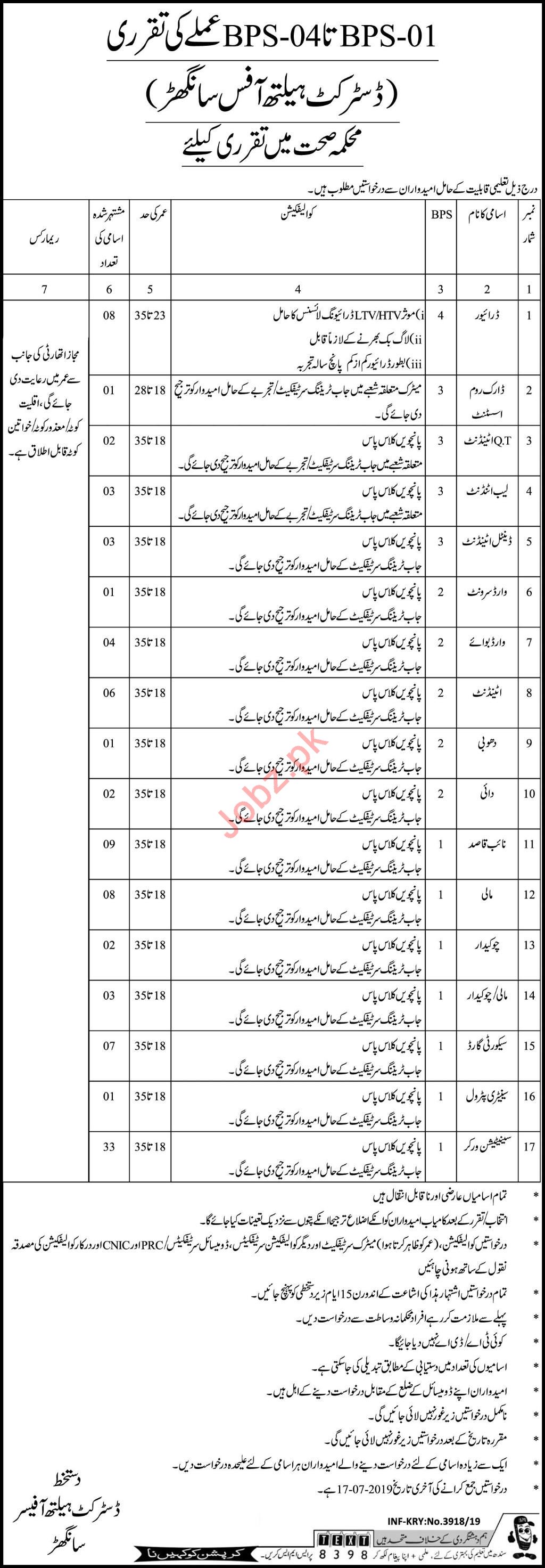 A Well-Known Government Organization District Health Office in Sanghar is looking for qualified, expert and Well-Mannered staff for their Organization for the Job of Driver, Dark Room Assistant, OT Attendant, Lab Attendant, Dental Attendant, Ward Servant, Ward Boy, Attendant, Dhobi, Dai, Naib Qasid, Mali, Chowkidar, Security Guard, Sanitary Patrol and Sanitation Worker.