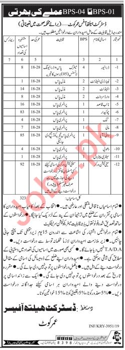 Health Department Government of Sindh required experienced and responsible personnel for the positions of Driver, Laboratory Attendant, Attendant, Ward Servant, Naib Qsaid, Chowkidar, Cook, Mali, Dai, Aya, Dhobi, Sanitary Patrol, Sanitation Worker in Umerkot Sindh 2019.