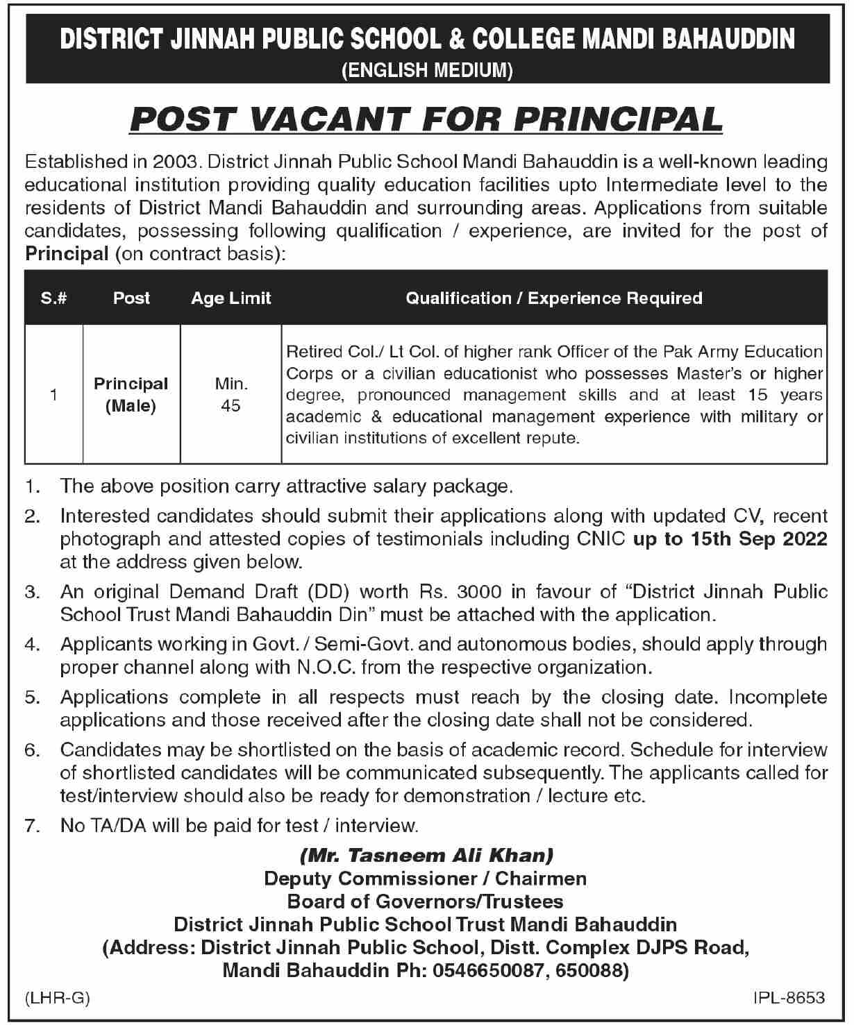 District Jinnah Public School and College is looking for candidates for following posts as per job advertisement published in daily Dawn Newspaper of August 27, 2022 for location Mandi Bahauddin, mandi bahauddin Punjab Pakistan: