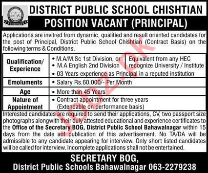 District Public School DPS Chishtian Jobs 2021 for Principal