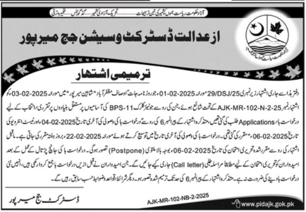 District & Session Court invites applications for job positions advertised in daily Ausaf dated 8 February 2025 for following vacancies in Mirpur, mirpur AJK Pakistan.