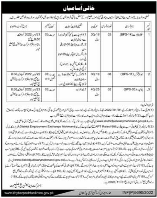 Vacant posts including clerk, chowkidar and steno typist are announced in District & Session Court Mohmand, mohmand Khyber Pakhtunkhwa KPK Pakistan as per 5 October 2022 advertisement in daily Mashriq Newspaper. Preferred Education is Matric, Intermediate, Primary and DAE etc.