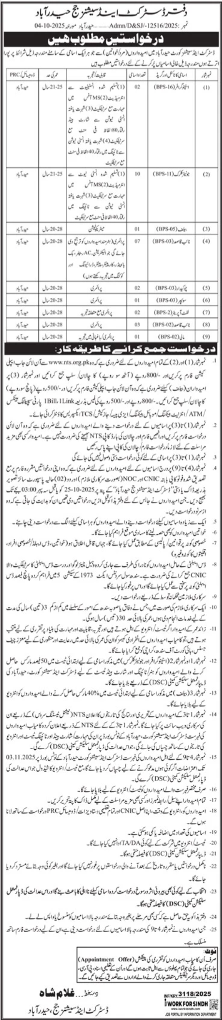 District & Session Judge is looking for candidates for following posts as per job advertisement published in daily Jang Newspaper of October 7, 2025 for location Hyderabad, hyderabad Sindh Pakistan: