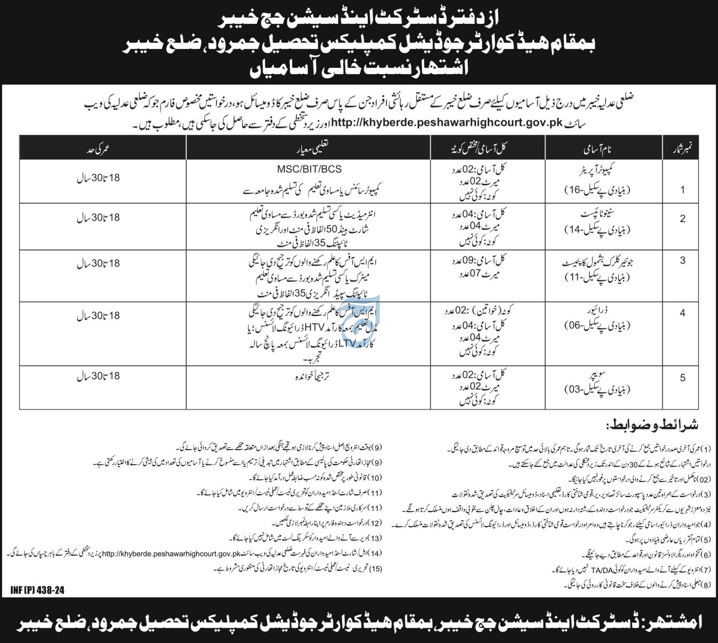 Vacant posts including sweeper, htv driver, driver, stenotypist, computer operator, clerk and ltv driver are announced in District & Session Judge Khyber, khyber Khyber Pakhtunkhwa KPK Pakistan as per 7 March 2024 advertisement in daily Jang Newspaper. BIT, Primary, Master, BCS, Middle, M.sc, Matric, Intermediate and Bachelor etc. educational qualification will be preferred.