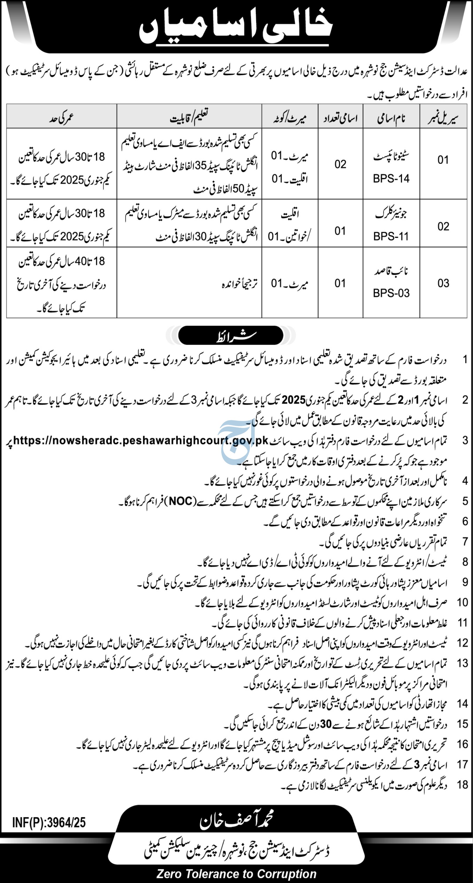District & Session Judge jobs advertisement dated about 23 September 2025 in daily Aaj Newspaper invites application for the vacant post of naib qasid, stenotypist and clerk in Nowshera, nowshera Khyber Pakhtunkhwa KPK Pakistan. Persons with Intermediate, Middle and Matric etc. education can apply.