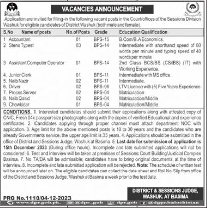 Vacant posts including stenotypist, process server, naib nazir, chowkidar, accountant, driver, naib qasid, clerk and assistant computer ooperator are announced in District & Session Judge Washuk, washuk Balochistan Pakistan as per 5 December 2023 advertisement in daily Jang Newspaper. Preferred Education is Matric, Middle, Intermediate, Bachelor, Others, BA, B.com and BCS etc.