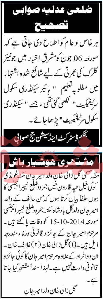 Vacant posts including clerk are announced in District & Session Judge Swabi, swabi Khyber Pakhtunkhwa KPK Pakistan as per 19 June 2025 advertisement in daily Mashriq Newspaper. Intermediate and Matric etc. educational qualification will be preferred.