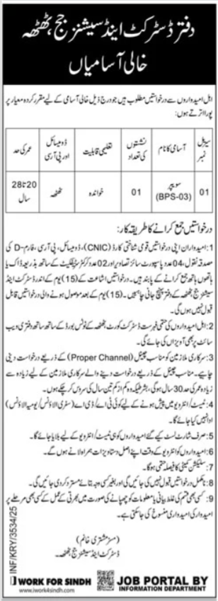 District & Session Judge invites applications for job positions advertised in daily Jang dated 26 October 2025 for following vacancies in Thatta, thatta Sindh Pakistan.