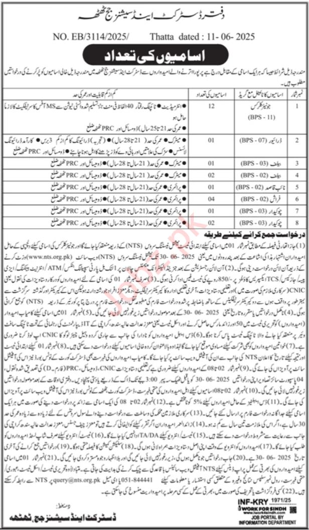 District & Session Judge invites applications for job positions advertised in daily Jang dated 15 June 2025 for following vacancies in Thatta, thatta Sindh Pakistan.