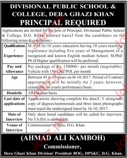 Applications are invited for the post of Principal, Divisional Public School & College, D.G. Khan (contract basis) from the candidates on the following terms & conditions:-
