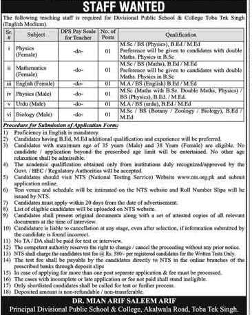 Divisional Public School & College DPS&C Toba Tek Singh, Government of the Punjab is seeking candidates for the posts of Teacher, Lecturer, Physics Teacher, Mathematics Teacher, Female Teacher, English Teacher, Urdu Teacher, Biology Teacher, Female Lecturer.