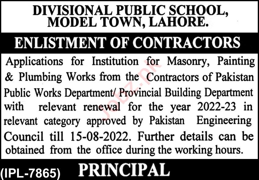 Vacant posts including contractor are announced in Divisional Public School Lahore, lahore Punjab Pakistan as per 31 July 2022 advertisement in daily Nawaiwaqt Newspaper. Persons with Intermediate and Matric etc. education can apply.