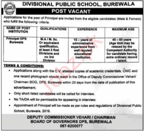 Vacant posts including principal are announced in Divisional Public School & College Burewala, burewala Punjab Pakistan as per 2 April 2023 advertisement in daily Nawaiwaqt Newspaper. Master, MA and M.sc etc. educational qualification will be preferred.