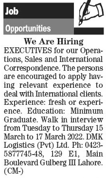 DMK Logistics Pvt Ltd jobs advertisement dated about 14 March 2022 in daily The News Newspaper invites application for the vacant post of executive, operations executive and sales executive in Lahore, lahore Punjab Pakistan. Persons with Master and Bachelor etc. education can apply.
